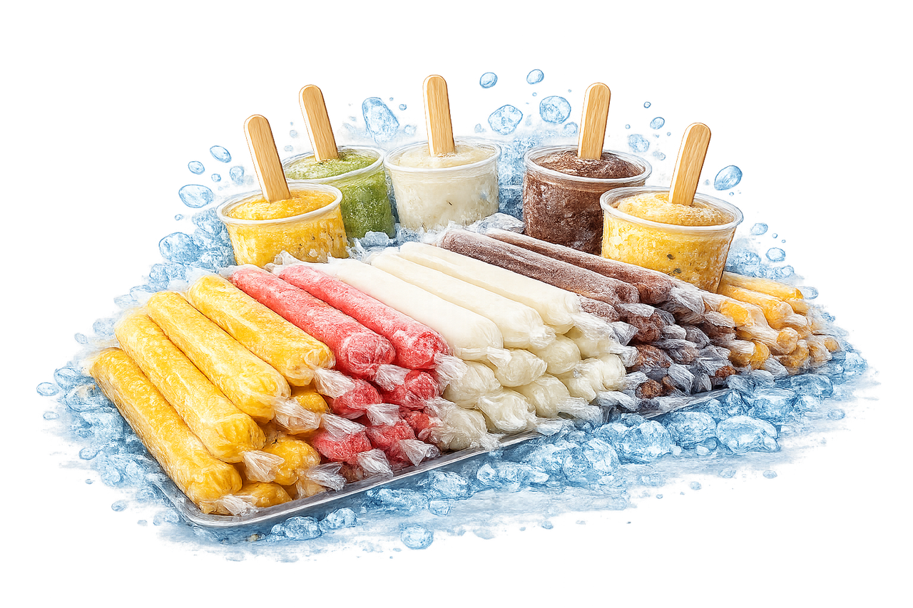 Helados de agua en bolsitas alargadas, refrescantes y llenos de sabor frutal. Ideales para días calurosos.